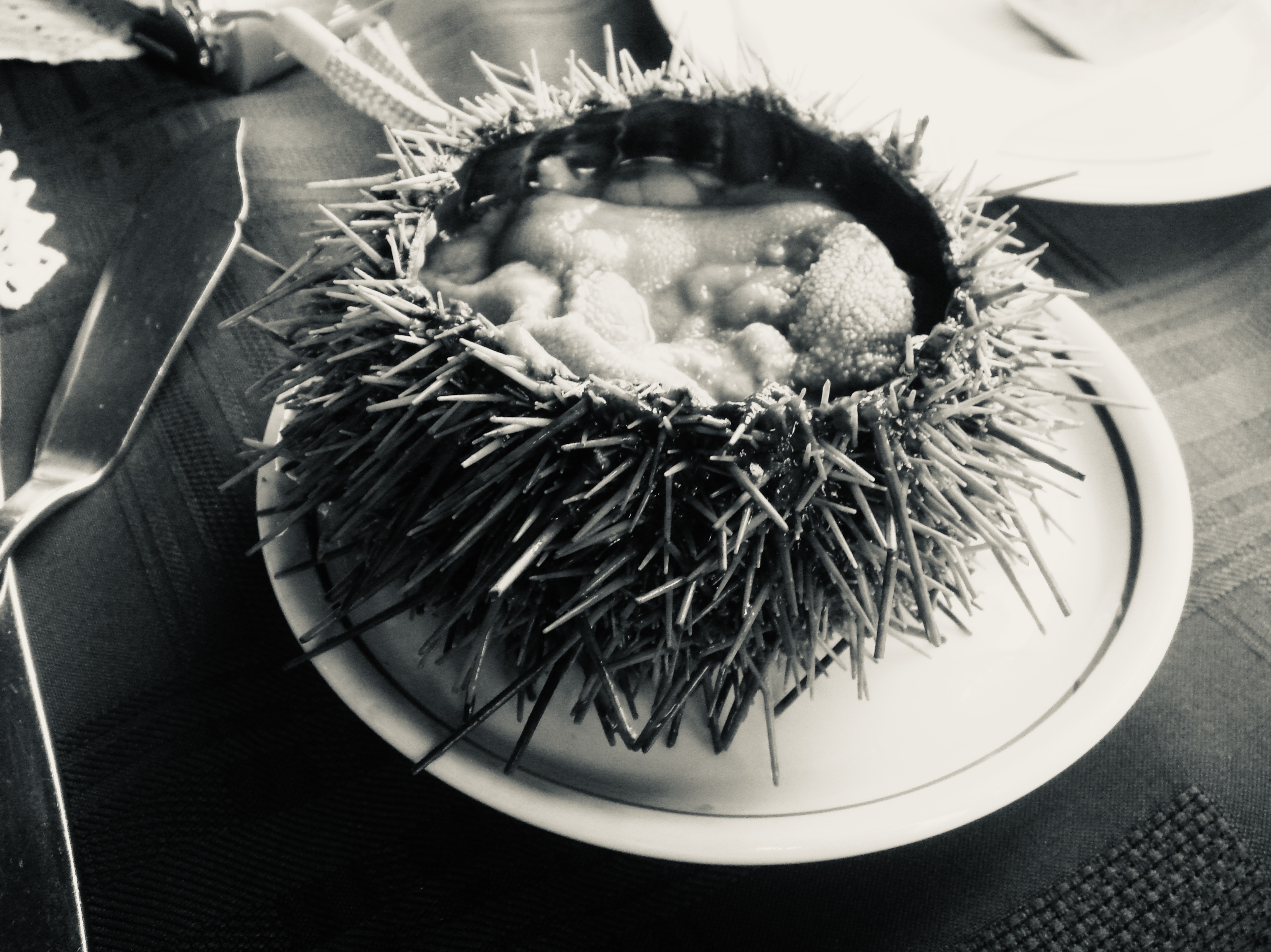 Last night I ate sea urchin. It tasted of the ocean. The body soaked with the tears of whales crying for the loss of their children. The warm fur of a white seal pup before it meets its end at the hand of cruelty. The plastic embrace of a shopping bag around the throat of an arctic tern. It cried for its fish brothers that nevermore would dart between its feelers searching for food. It whispered to me of lost porpoises trapped in nets raping the sea. It told of sharks too fearful to leave the sunken ships of death’s folly. I heard the boasts of old sailors swapping trinkets for lives. I stopped a moment and put the chopsticks down. Then ordered another item from the menu. One without the bitter taste.