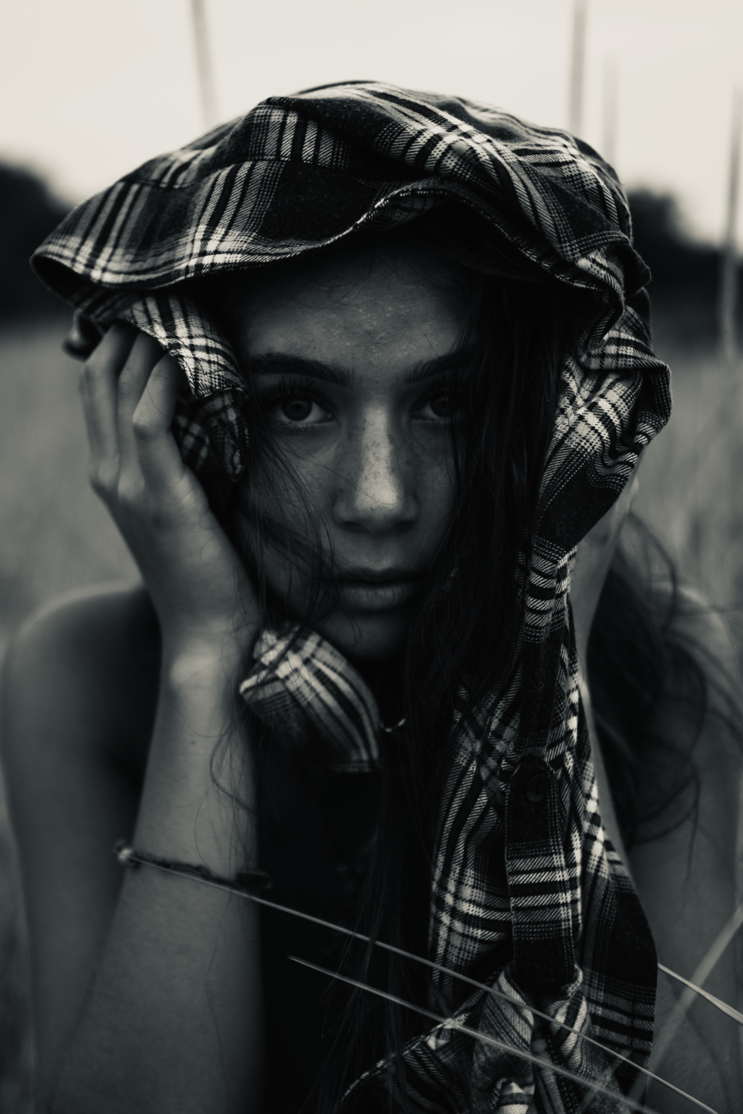 Woman covering her head with blue plaid scarf